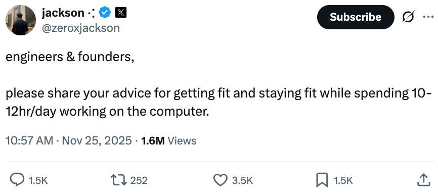Heading into the holiday season and end of year, there is a lot of chatter with founders regarding taking care of health while working long hours (aka 996). This recent post got a ton of traction, with some great tactical advice in the comments: